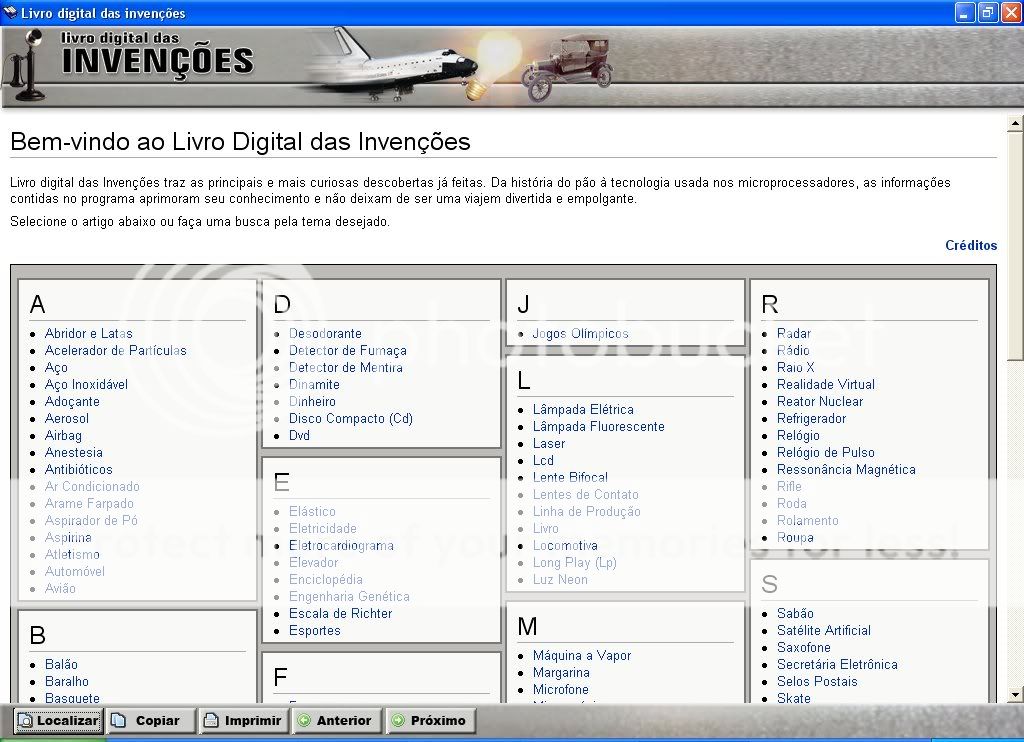 Essa revista eletrônica traz consigo praticamente todas as invenções do mundo, desde as principais, as mais curiosas e as que você nunca ouviu falar! Da história do pão até a tecnologia usada nos microprocessadores, com esse programa você vai aprender de uma forma divertida e que não deixa ninguém na mão.Titulo: Revista Digital - Todas as Invenções do Mundo